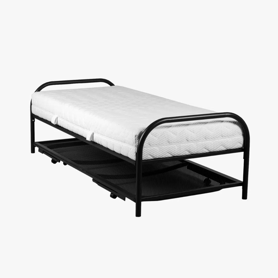 Dit ruimtebesparende bed bestaat uit een sterk onder- en bovenbed met dwarsgespannen spiralen die zorgen voor een hoge mate van comfort. Het onderbed is voorzien van wieltjes, waardoor je eenvoudig het tweede bed opzet. Ook is er tussen het onder- en bovenbed genoeg ruimte voor het wegbergen van een matras.